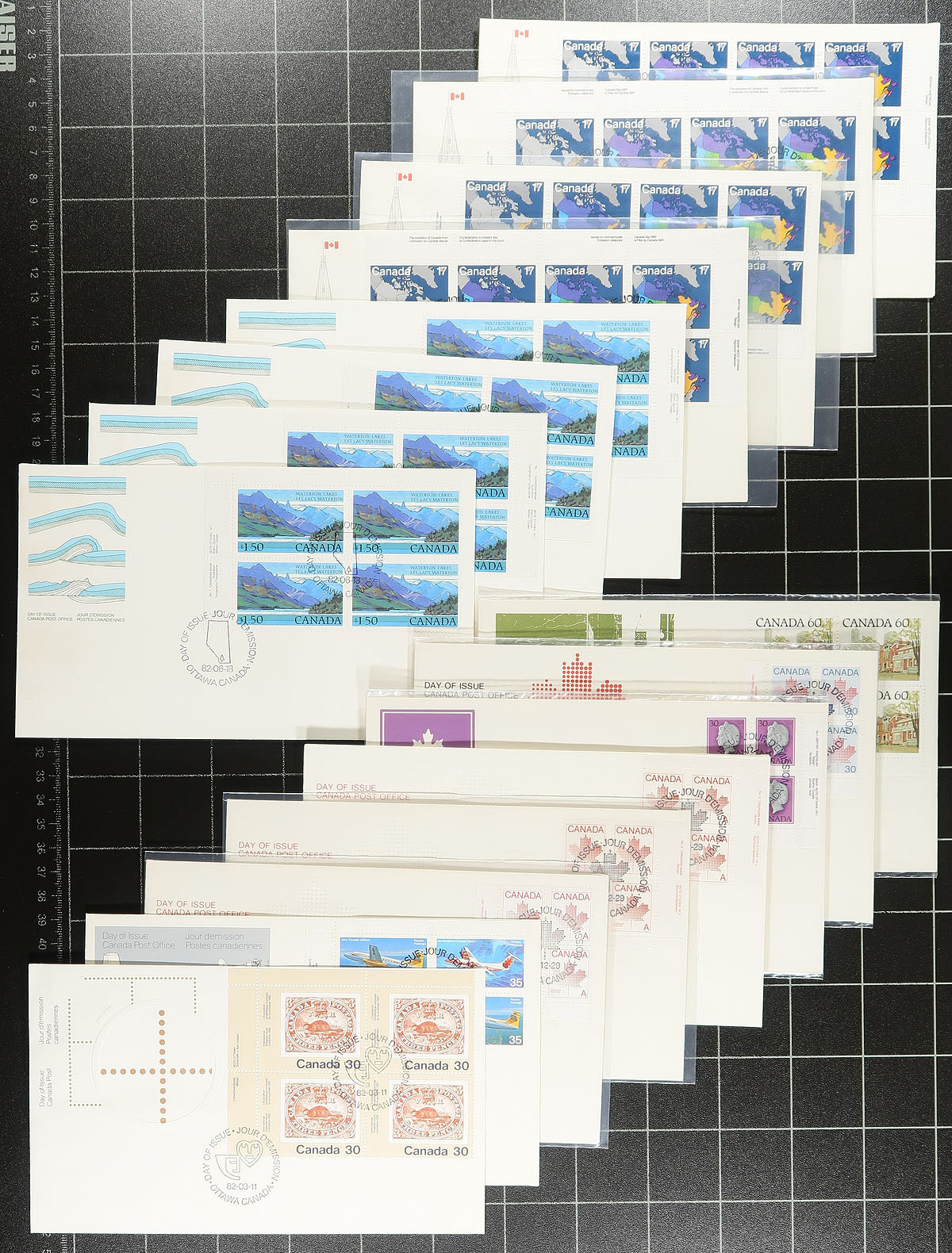 First Day Covers. About 220 Canada Post Cachet First Day Covers from the 1970's-1980's, each with a plate block. Some are single positions; a few are matched sets (like the $1.50 Waterton Lakes). There may be a bit of duplication, but sometimes they will be for different corners. The quadrupled cost limited the number of collectors who would acquire these covers, when new. They are now a very popular niche of the FDC hobby. Estimate =
