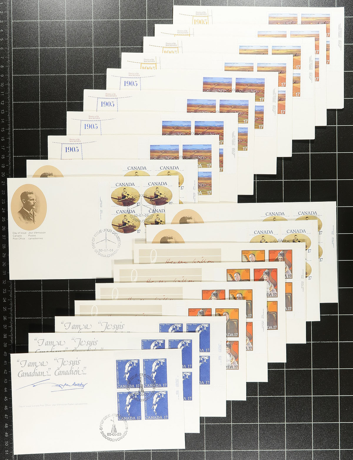First Day Covers. About 220 Canada Post Cachet First Day Covers from the 1970's-1980's, each with a plate block. Some are single positions; a few are matched sets (like the $1.50 Waterton Lakes). There may be a bit of duplication, but sometimes they will be for different corners. The quadrupled cost limited the number of collectors who would acquire these covers, when new. They are now a very popular niche of the FDC hobby. Estimate =