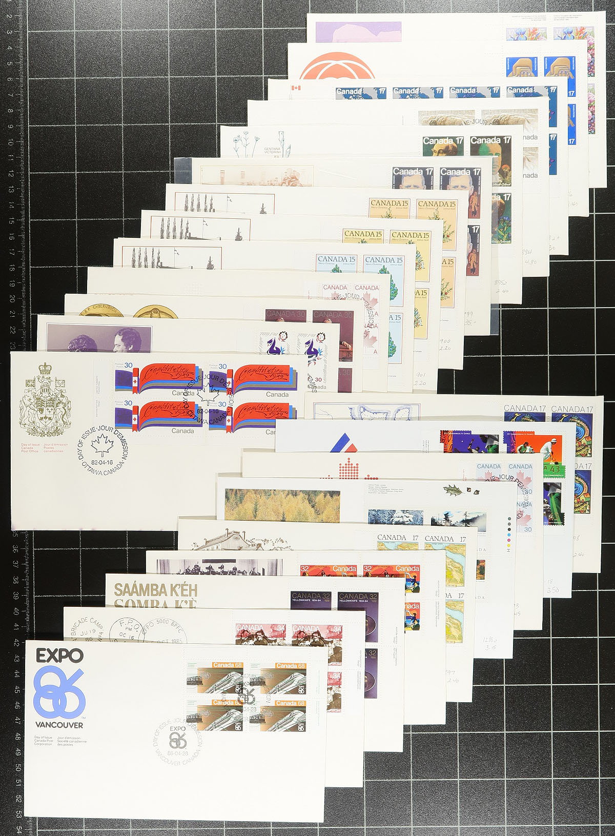 First Day Covers. About 220 Canada Post Cachet First Day Covers from the 1970's-1980's, each with a plate block. Some are single positions; a few are matched sets (like the $1.50 Waterton Lakes). There may be a bit of duplication, but sometimes they will be for different corners. The quadrupled cost limited the number of collectors who would acquire these covers, when new. They are now a very popular niche of the FDC hobby. Estimate =