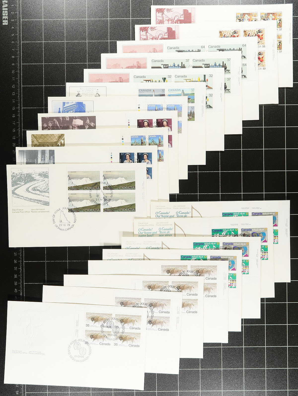 First Day Covers. About 220 Canada Post Cachet First Day Covers from the 1970's-1980's, each with a plate block. Some are single positions; a few are matched sets (like the $1.50 Waterton Lakes). There may be a bit of duplication, but sometimes they will be for different corners. The quadrupled cost limited the number of collectors who would acquire these covers, when new. They are now a very popular niche of the FDC hobby. Estimate =