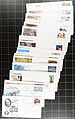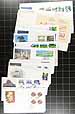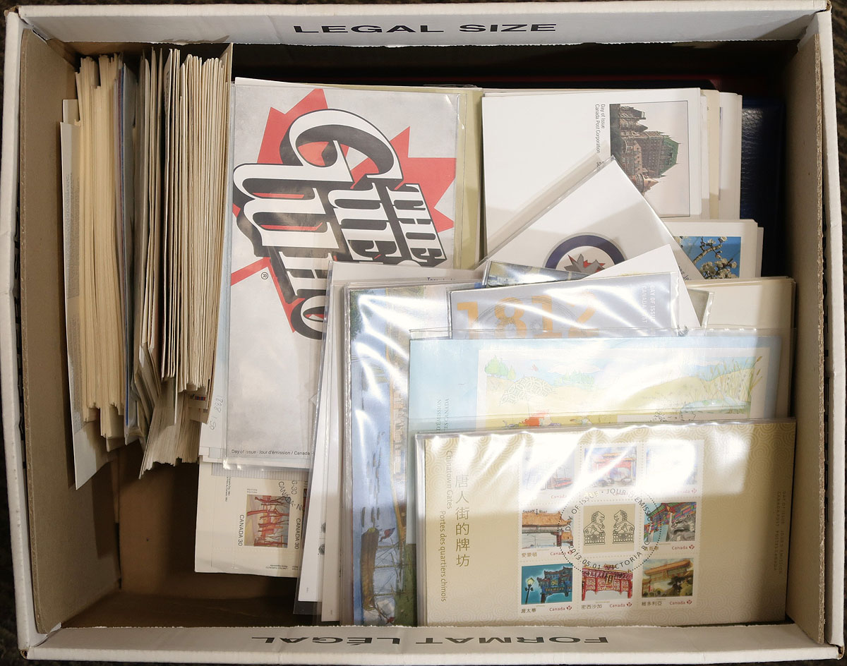 First Day Covers. Haul of mostly Canada Post cachets for issues from 1965-2007. Patchy coverage at times, and mostly single stamps with a few plate blocks and souvenir sheets. Many are loose, but there are three various cover albums packed with covers. Probably 400, mostly different, with some private cachets up to about 1975, but these are less than 10% of the lot. Fills a banker’s box. Estimate =