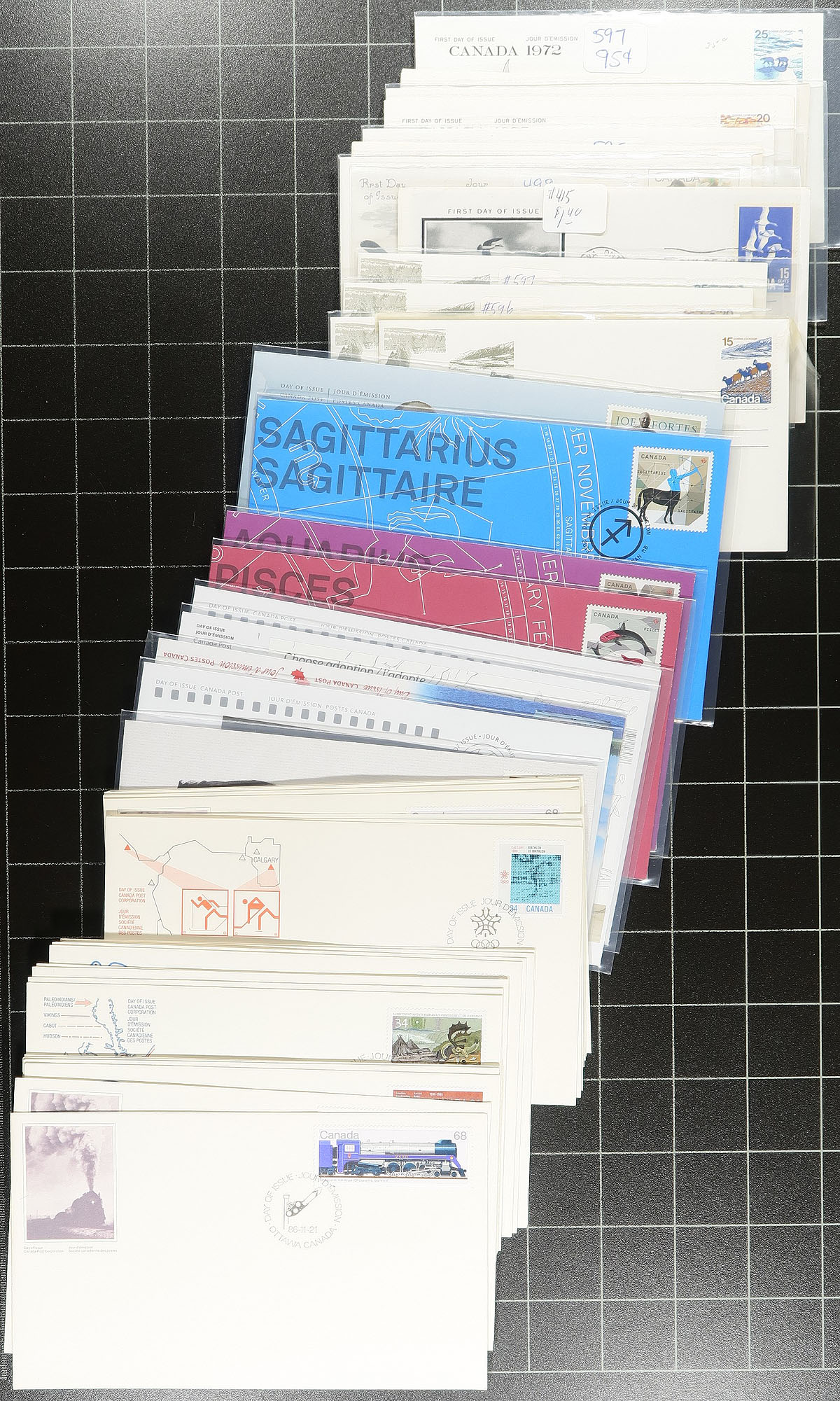 First Day Covers. Haul of mostly Canada Post cachets for issues from 1965-2007. Patchy coverage at times, and mostly single stamps with a few plate blocks and souvenir sheets. Many are loose, but there are three various cover albums packed with covers. Probably 400, mostly different, with some private cachets up to about 1975, but these are less than 10% of the lot. Fills a banker’s box. Estimate =