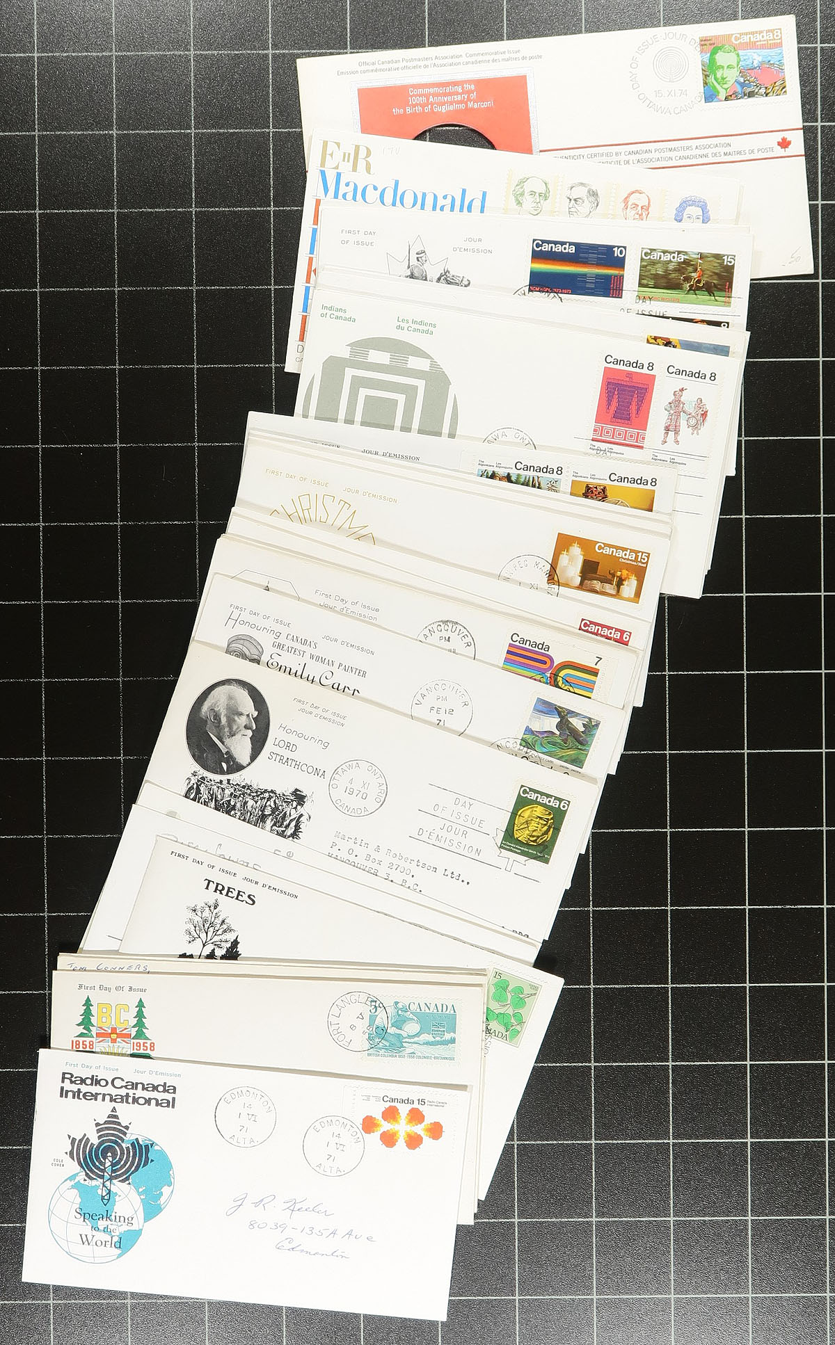 First Day Covers. Haul of mostly Canada Post cachets for issues from 1965-2007. Patchy coverage at times, and mostly single stamps with a few plate blocks and souvenir sheets. Many are loose, but there are three various cover albums packed with covers. Probably 400, mostly different, with some private cachets up to about 1975, but these are less than 10% of the lot. Fills a banker’s box. Estimate =