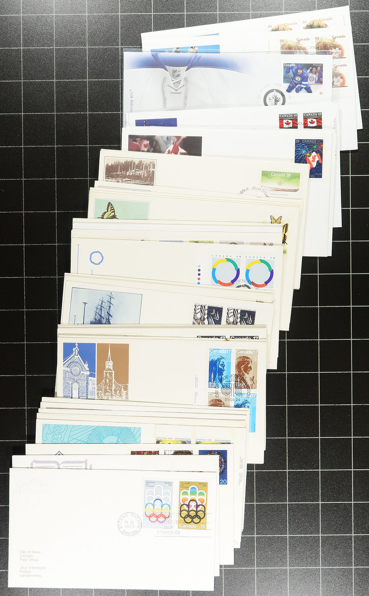 First Day Covers. Haul of mostly Canada Post cachets for issues from 1965-2007. Patchy coverage at times, and mostly single stamps with a few plate blocks and souvenir sheets. Many are loose, but there are three various cover albums packed with covers. Probably 400, mostly different, with some private cachets up to about 1975, but these are less than 10% of the lot. Fills a banker’s box. Estimate =