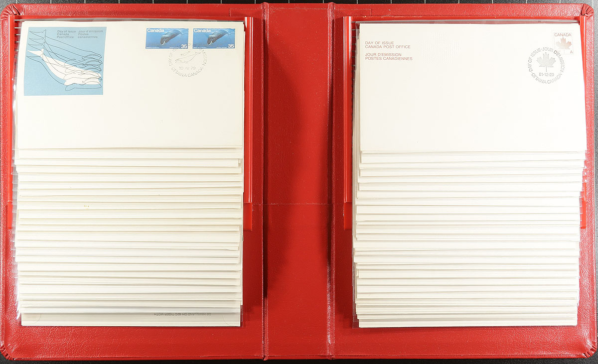 First Day Covers. Haul of mostly Canada Post cachets for issues from 1965-2007. Patchy coverage at times, and mostly single stamps with a few plate blocks and souvenir sheets. Many are loose, but there are three various cover albums packed with covers. Probably 400, mostly different, with some private cachets up to about 1975, but these are less than 10% of the lot. Fills a banker’s box. Estimate =