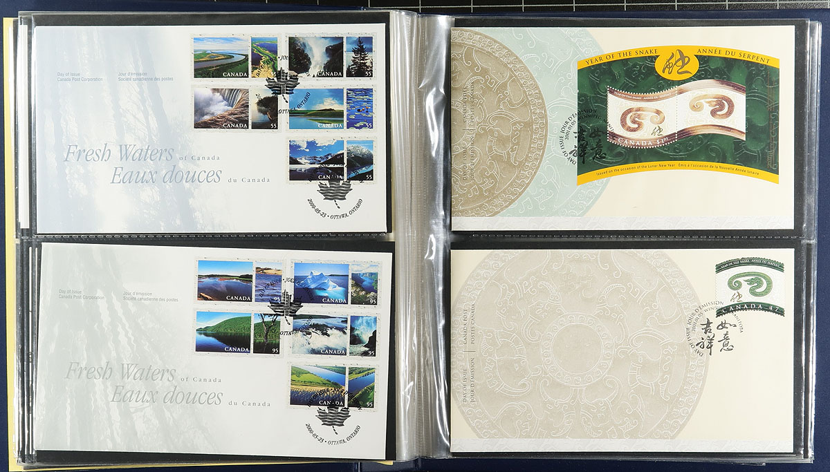 First Day Covers. Haul of mostly Canada Post cachets for issues from 1965-2007. Patchy coverage at times, and mostly single stamps with a few plate blocks and souvenir sheets. Many are loose, but there are three various cover albums packed with covers. Probably 400, mostly different, with some private cachets up to about 1975, but these are less than 10% of the lot. Fills a banker’s box. Estimate =