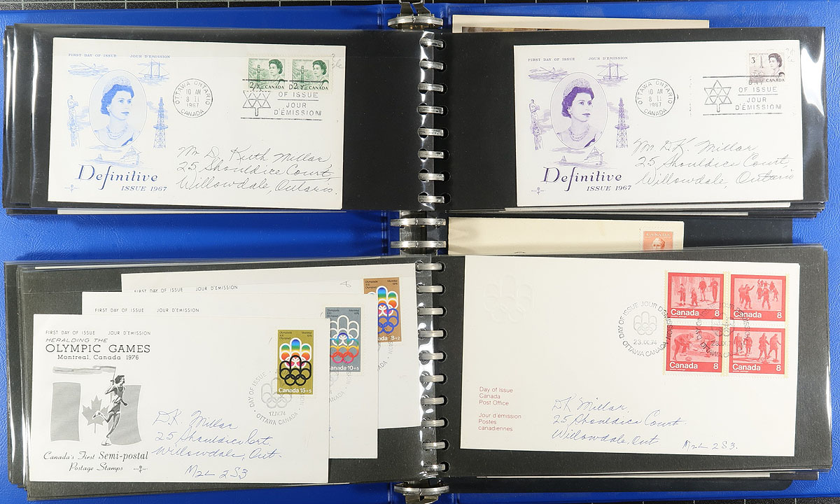 First Day Covers. Haul of mostly Canada Post cachets for issues from 1965-2007. Patchy coverage at times, and mostly single stamps with a few plate blocks and souvenir sheets. Many are loose, but there are three various cover albums packed with covers. Probably 400, mostly different, with some private cachets up to about 1975, but these are less than 10% of the lot. Fills a banker’s box. Estimate =