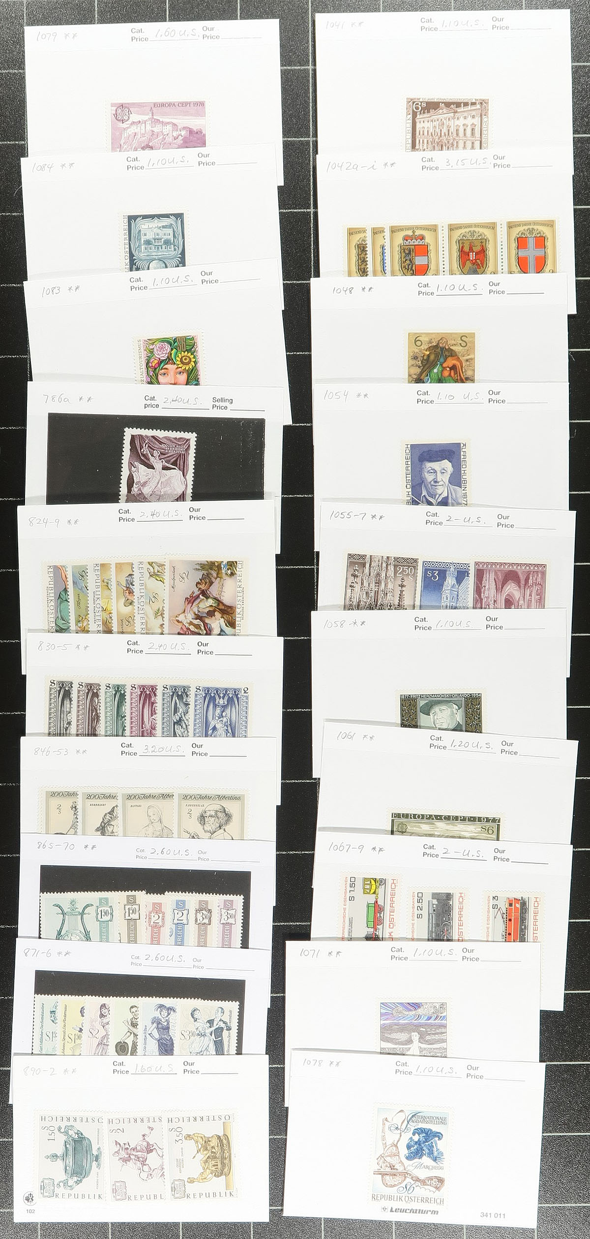 Big bundle of Austria with mostly mint from the post-war era up to 2013. Noted #514-515, #963A and back of the book semi-postals (#B260-B263) and postage dues. Some are mounted in a lovely 1978-89 Lindner hingeless album in a near-new red coloured 18-ring binder (filled with mint stamps). There are more stamps on stock cards and "102" cards, and a small, mounted collection of used issues back to the 19th century. Finishes with a group of 150 different "ETB" First Day panels (a few with minor edge toning, for the record). Amongst the mint, the owners’ Scott catalogue value is over US$1000.00. Estimate =