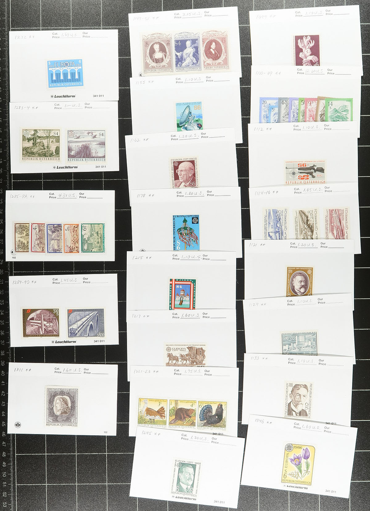 Big bundle of Austria with mostly mint from the post-war era up to 2013. Noted #514-515, #963A and back of the book semi-postals (#B260-B263) and postage dues. Some are mounted in a lovely 1978-89 Lindner hingeless album in a near-new red coloured 18-ring binder (filled with mint stamps). There are more stamps on stock cards and "102" cards, and a small, mounted collection of used issues back to the 19th century. Finishes with a group of 150 different "ETB" First Day panels (a few with minor edge toning, for the record). Amongst the mint, the owners’ Scott catalogue value is over US$1000.00. Estimate =