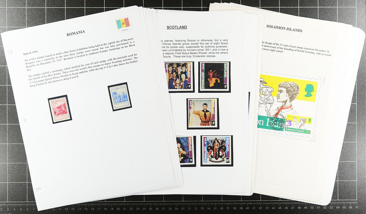 Extensive Scout thematic collection in two binders, with a healthy mix of stamps, souvenir sheets, covers (both philatelic and commercial), cancels and a bit of ephemera (including Cinderellas). The stamps are in black mounts and neatly typed up, including write-ups for the relatively few items that the collector doesn’t have. The pile of pages alone is 10cm/4" deep. Many hundreds of different stamps, and dozens of covers. An enormous effort to build this. Estimate =