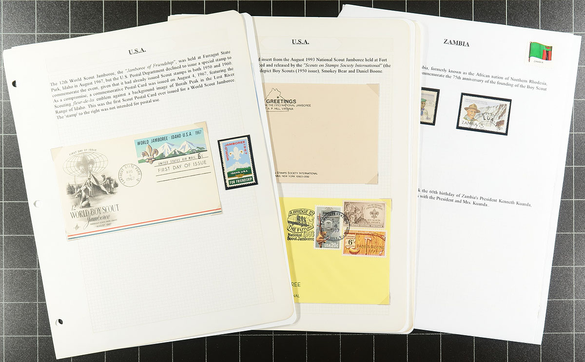 Extensive Scout thematic collection in two binders, with a healthy mix of stamps, souvenir sheets, covers (both philatelic and commercial), cancels and a bit of ephemera (including Cinderellas). The stamps are in black mounts and neatly typed up, including write-ups for the relatively few items that the collector doesn’t have. The pile of pages alone is 10cm/4" deep. Many hundreds of different stamps, and dozens of covers. An enormous effort to build this. Estimate =