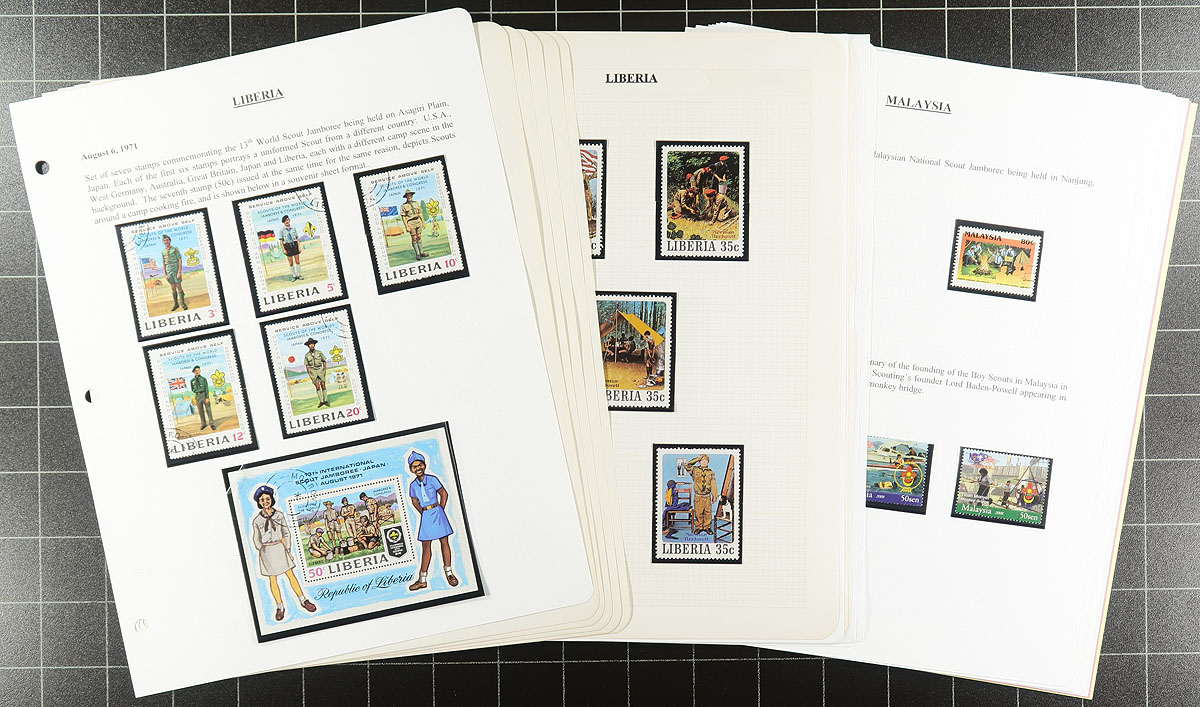 Extensive Scout thematic collection in two binders, with a healthy mix of stamps, souvenir sheets, covers (both philatelic and commercial), cancels and a bit of ephemera (including Cinderellas). The stamps are in black mounts and neatly typed up, including write-ups for the relatively few items that the collector doesn’t have. The pile of pages alone is 10cm/4" deep. Many hundreds of different stamps, and dozens of covers. An enormous effort to build this. Estimate =