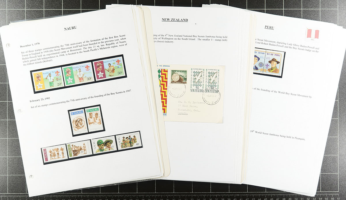 Extensive Scout thematic collection in two binders, with a healthy mix of stamps, souvenir sheets, covers (both philatelic and commercial), cancels and a bit of ephemera (including Cinderellas). The stamps are in black mounts and neatly typed up, including write-ups for the relatively few items that the collector doesn’t have. The pile of pages alone is 10cm/4" deep. Many hundreds of different stamps, and dozens of covers. An enormous effort to build this. Estimate =