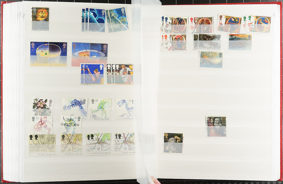 Two stockbooks with a used stock from early Queen Victoria issues to about 2012. The regular issues are in a worn 64-page stockbook, most with 1-3 copies of a type. Includes a couple of later purchases of QV-KEVII issues that the collector didn’t get around to processing. The 16-page stockbook has a basic group of Machins, sorted by denomination. Both stockbooks are red covered Lighthouse brand. Estimate =