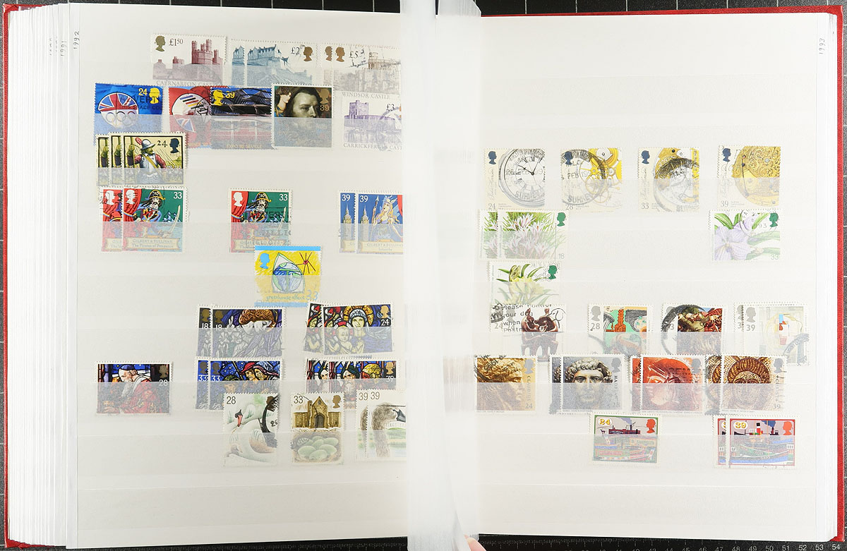 Two stockbooks with a used stock from early Queen Victoria issues to about 2012. The regular issues are in a worn 64-page stockbook, most with 1-3 copies of a type. Includes a couple of later purchases of QV-KEVII issues that the collector didn’t get around to processing. The 16-page stockbook has a basic group of Machins, sorted by denomination. Both stockbooks are red covered Lighthouse brand. Estimate =