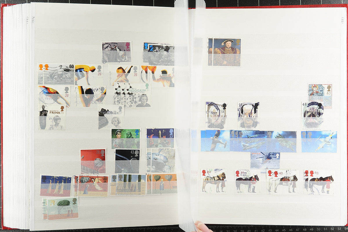 Two stockbooks with a used stock from early Queen Victoria issues to about 2012. The regular issues are in a worn 64-page stockbook, most with 1-3 copies of a type. Includes a couple of later purchases of QV-KEVII issues that the collector didn’t get around to processing. The 16-page stockbook has a basic group of Machins, sorted by denomination. Both stockbooks are red covered Lighthouse brand. Estimate =