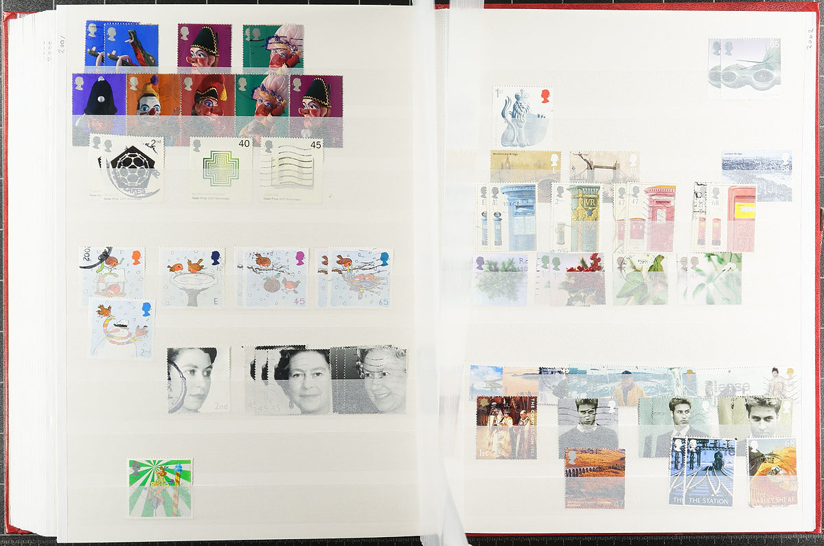 Two stockbooks with a used stock from early Queen Victoria issues to about 2012. The regular issues are in a worn 64-page stockbook, most with 1-3 copies of a type. Includes a couple of later purchases of QV-KEVII issues that the collector didn’t get around to processing. The 16-page stockbook has a basic group of Machins, sorted by denomination. Both stockbooks are red covered Lighthouse brand. Estimate =
