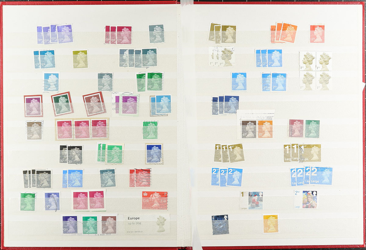 Two stockbooks with a used stock from early Queen Victoria issues to about 2012. The regular issues are in a worn 64-page stockbook, most with 1-3 copies of a type. Includes a couple of later purchases of QV-KEVII issues that the collector didn’t get around to processing. The 16-page stockbook has a basic group of Machins, sorted by denomination. Both stockbooks are red covered Lighthouse brand. Estimate =