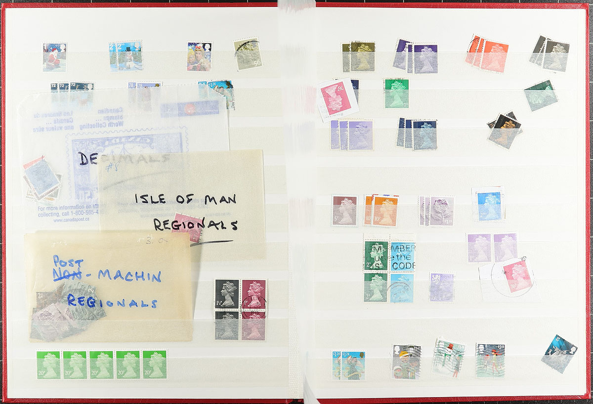 Two stockbooks with a used stock from early Queen Victoria issues to about 2012. The regular issues are in a worn 64-page stockbook, most with 1-3 copies of a type. Includes a couple of later purchases of QV-KEVII issues that the collector didn’t get around to processing. The 16-page stockbook has a basic group of Machins, sorted by denomination. Both stockbooks are red covered Lighthouse brand. Estimate =