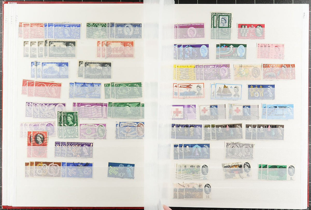 Two stockbooks with a used stock from early Queen Victoria issues to about 2012. The regular issues are in a worn 64-page stockbook, most with 1-3 copies of a type. Includes a couple of later purchases of QV-KEVII issues that the collector didn’t get around to processing. The 16-page stockbook has a basic group of Machins, sorted by denomination. Both stockbooks are red covered Lighthouse brand. Estimate =