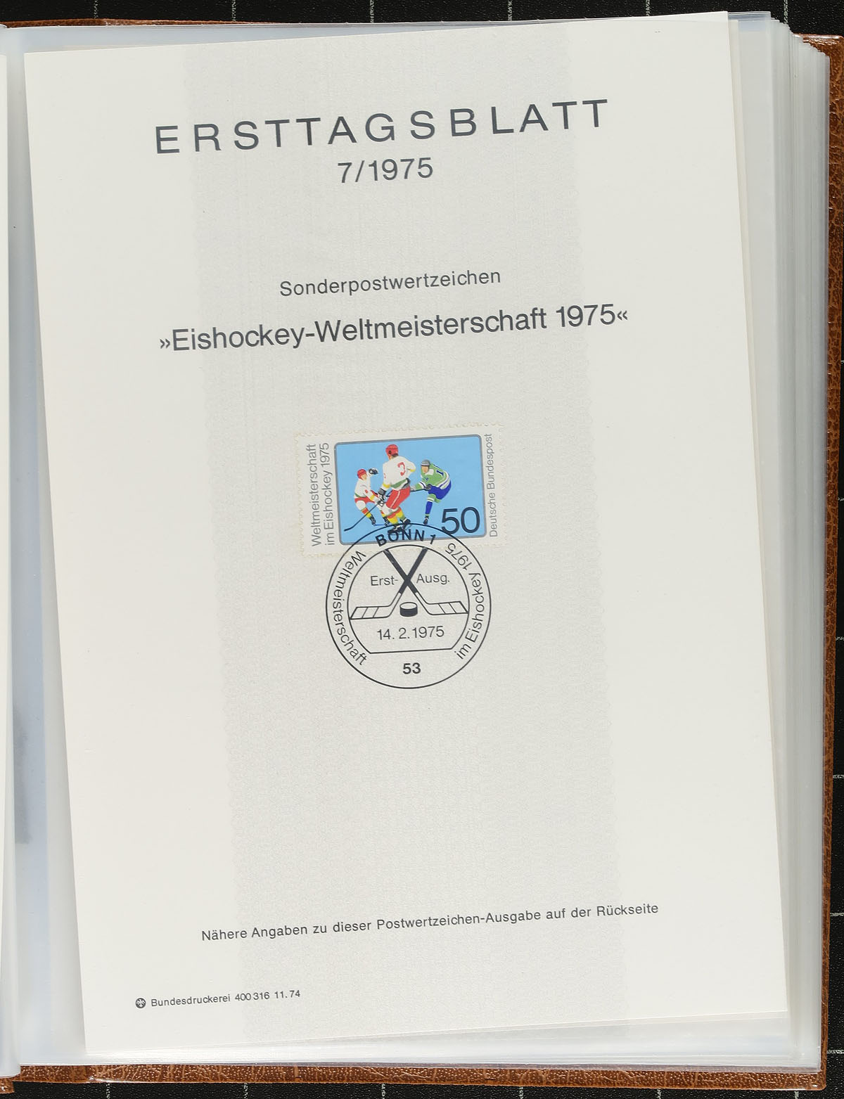 "Ersttagsblatt" (First Day Panels), mini-hoard from West Germany and Berlin, some in five assorted specialty binders, some in bundles. The West Germany includes panels from years 1974-1979 and 1993-1994. Berlin includes a few very early from 1956-1959, then 1975-79 and 1987-1990. Some in the bundles are duplicates a bit might be different. If you need anything more, there is a group of 88 empty pages from "Safe" for larger size ETBs (15cm x 21cm) no longer in production but had a retail price of $150.00). Estimate =