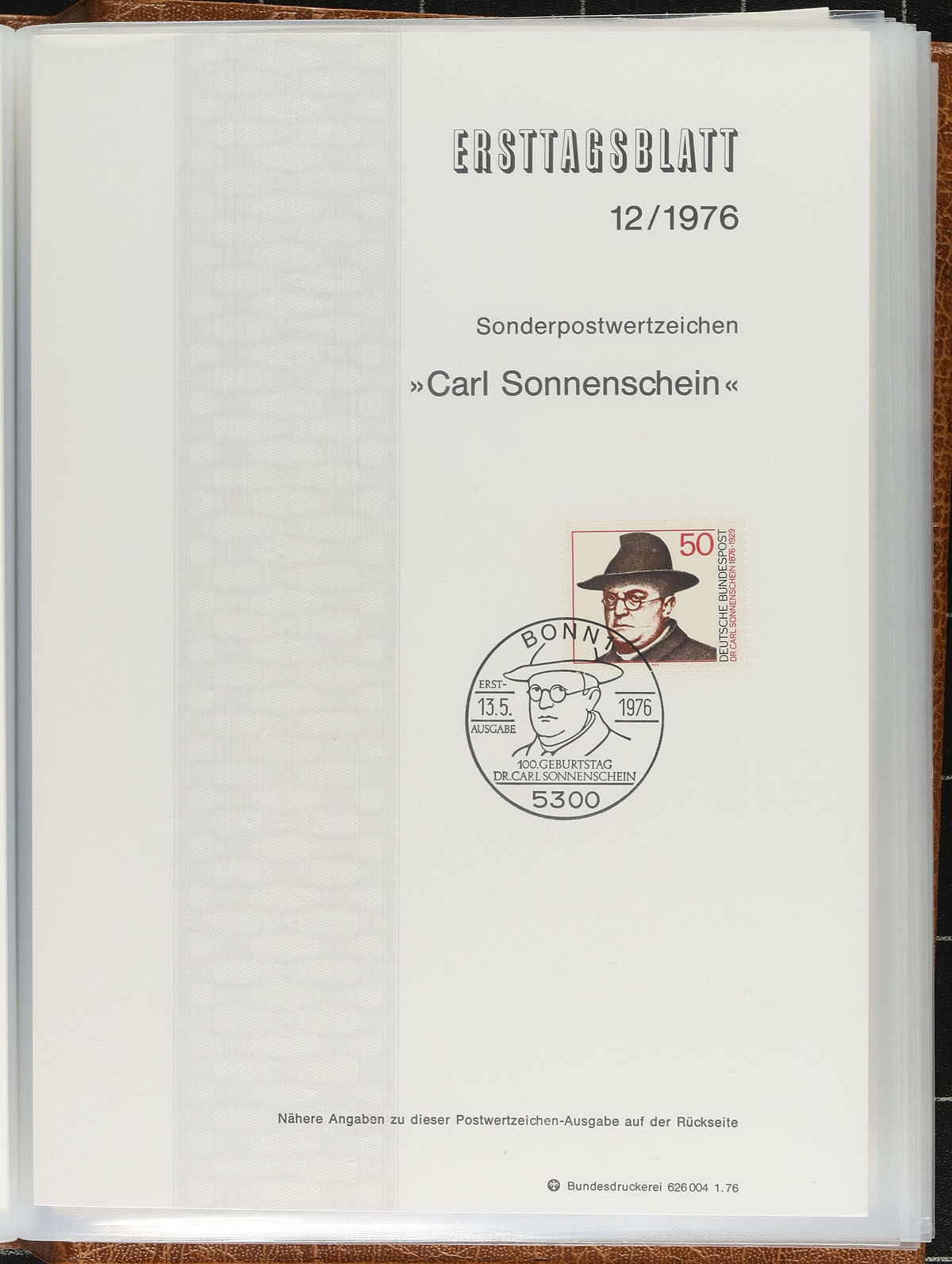 "Ersttagsblatt" (First Day Panels), mini-hoard from West Germany and Berlin, some in five assorted specialty binders, some in bundles. The West Germany includes panels from years 1974-1979 and 1993-1994. Berlin includes a few very early from 1956-1959, then 1975-79 and 1987-1990. Some in the bundles are duplicates a bit might be different. If you need anything more, there is a group of 88 empty pages from "Safe" for larger size ETBs (15cm x 21cm) no longer in production but had a retail price of $150.00). Estimate =