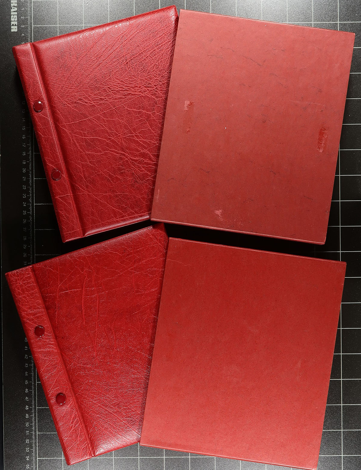 "Ersttagsblatt" (First Day Panels), mini-hoard from West Germany and Berlin, some in five assorted specialty binders, some in bundles. The West Germany includes panels from years 1974-1979 and 1993-1994. Berlin includes a few very early from 1956-1959, then 1975-79 and 1987-1990. Some in the bundles are duplicates a bit might be different. If you need anything more, there is a group of 88 empty pages from "Safe" for larger size ETBs (15cm x 21cm) no longer in production but had a retail price of $150.00). Estimate =
