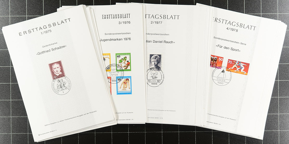 "Ersttagsblatt" (First Day Panels), mini-hoard from West Germany and Berlin, some in five assorted specialty binders, some in bundles. The West Germany includes panels from years 1974-1979 and 1993-1994. Berlin includes a few very early from 1956-1959, then 1975-79 and 1987-1990. Some in the bundles are duplicates a bit might be different. If you need anything more, there is a group of 88 empty pages from "Safe" for larger size ETBs (15cm x 21cm) no longer in production but had a retail price of $150.00). Estimate =