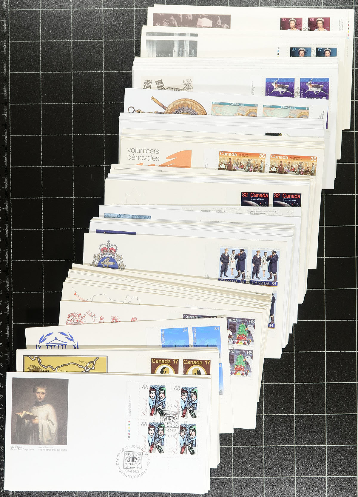 First Day Covers. Expensive First Day Cover Box #1: A large shoebox with a mix of mostly 1980's-1990's Canada Post Cacheted FDCs, with many plate blocks, including a number of matched sets, from a collector who didn’t shy away from the high cost (the $1, $2, $5 from the "Architecture" set are here in plate block matched sets,stamps face value $128.00 alone), same for the "Mammals", and the list goes on. Includes some singles and pairs, and a small group of large "Art" FDCs. A quick browse indicates that the stamps’ face value is over $500.00. All unaddressed and appear to be in good condition. Estimate =