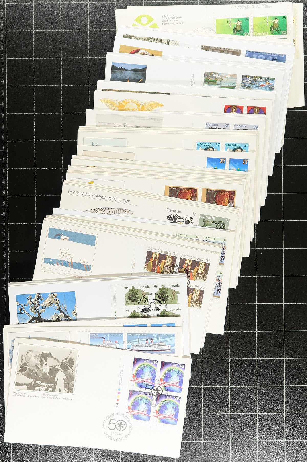 First Day Covers. Expensive First Day Cover Box #1: A large shoebox with a mix of mostly 1980's-1990's Canada Post Cacheted FDCs, with many plate blocks, including a number of matched sets, from a collector who didn’t shy away from the high cost (the $1, $2, $5 from the "Architecture" set are here in plate block matched sets,stamps face value $128.00 alone), same for the "Mammals", and the list goes on. Includes some singles and pairs, and a small group of large "Art" FDCs. A quick browse indicates that the stamps’ face value is over $500.00. All unaddressed and appear to be in good condition. Estimate =