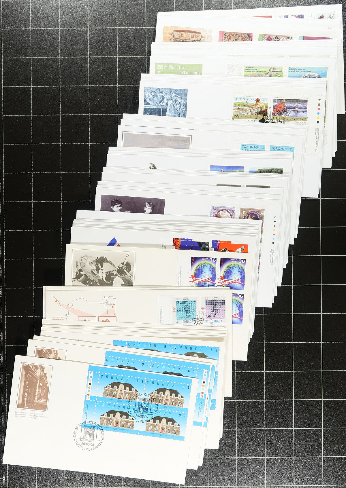 First Day Covers. Expensive First Day Cover Box #1: A large shoebox with a mix of mostly 1980's-1990's Canada Post Cacheted FDCs, with many plate blocks, including a number of matched sets, from a collector who didn’t shy away from the high cost (the $1, $2, $5 from the "Architecture" set are here in plate block matched sets,stamps face value $128.00 alone), same for the "Mammals", and the list goes on. Includes some singles and pairs, and a small group of large "Art" FDCs. A quick browse indicates that the stamps’ face value is over $500.00. All unaddressed and appear to be in good condition. Estimate =