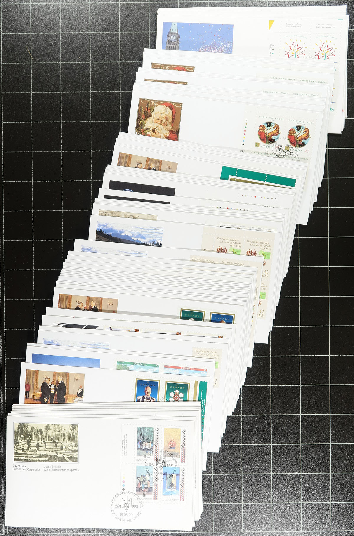 First Day Covers. Expensive First Day Cover Box #1: A large shoebox with a mix of mostly 1980's-1990's Canada Post Cacheted FDCs, with many plate blocks, including a number of matched sets, from a collector who didn’t shy away from the high cost (the $1, $2, $5 from the "Architecture" set are here in plate block matched sets,stamps face value $128.00 alone), same for the "Mammals", and the list goes on. Includes some singles and pairs, and a small group of large "Art" FDCs. A quick browse indicates that the stamps’ face value is over $500.00. All unaddressed and appear to be in good condition. Estimate =