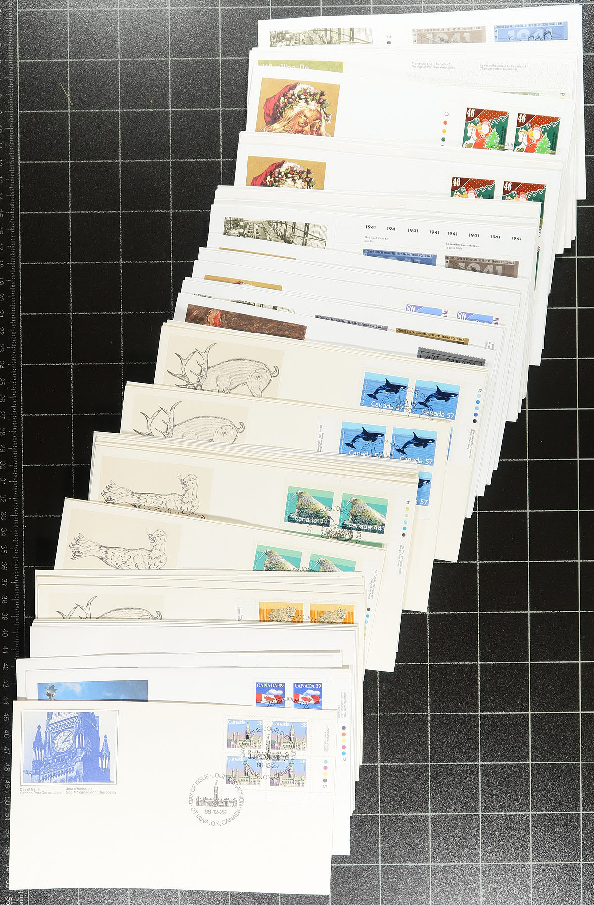 First Day Covers. Expensive First Day Cover Box #1: A large shoebox with a mix of mostly 1980's-1990's Canada Post Cacheted FDCs, with many plate blocks, including a number of matched sets, from a collector who didn’t shy away from the high cost (the $1, $2, $5 from the "Architecture" set are here in plate block matched sets,stamps face value $128.00 alone), same for the "Mammals", and the list goes on. Includes some singles and pairs, and a small group of large "Art" FDCs. A quick browse indicates that the stamps’ face value is over $500.00. All unaddressed and appear to be in good condition. Estimate =