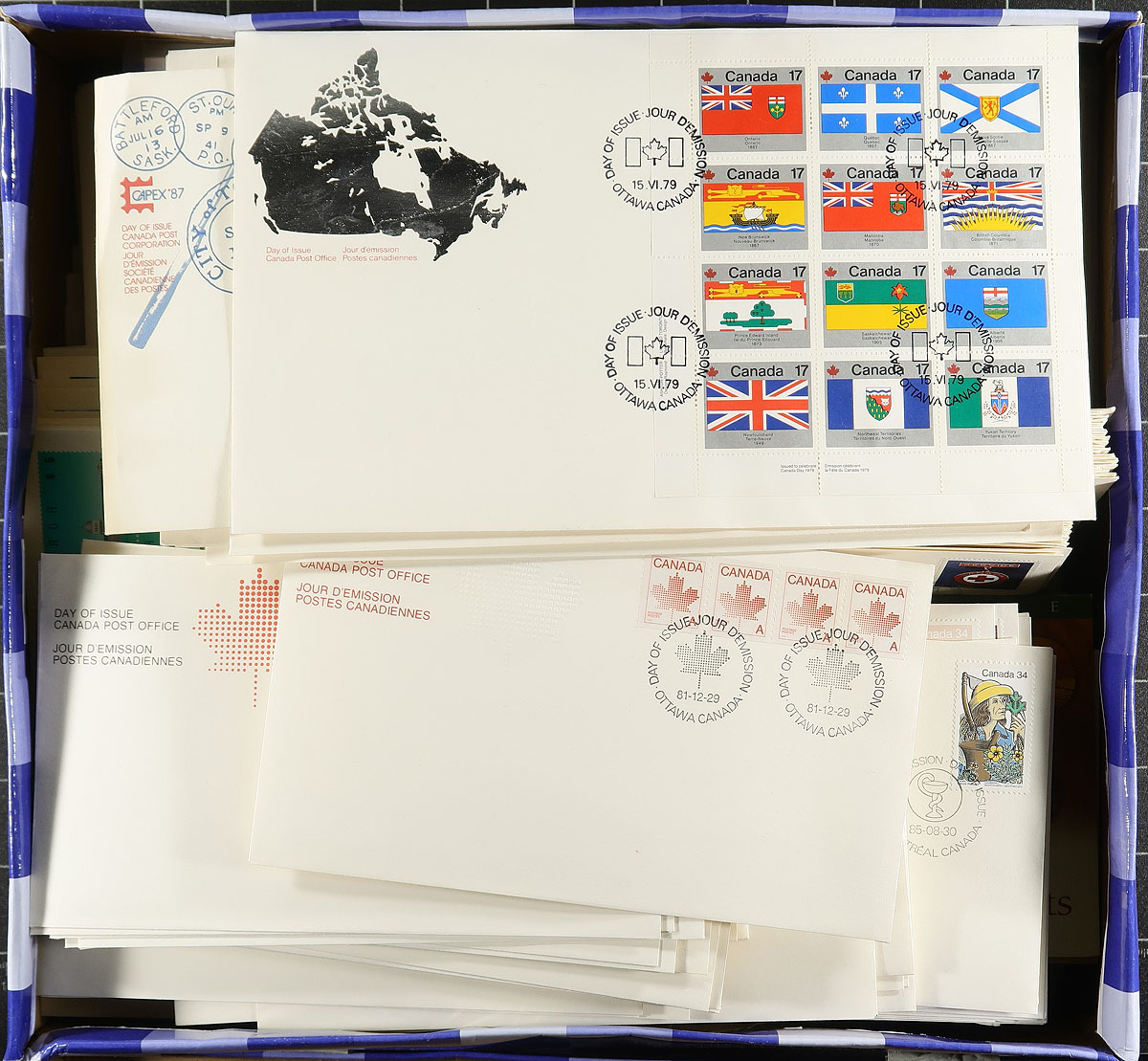 First Day Covers. Expensive First Day Cover Box #2: A large shoebox with a mix of mostly 1970's-1990's Canada Post Cacheted FDCs, with many plate blocks, including a number of matched sets, from a collector who didn’t shy away from the high cost (the $1, $2, $5 from the "Architecture" set are here in plate block matched sets, stamps face value $128.00), same for the "Mammals", and the list goes on. Includes some singles and pairs, and a small group of large "Canada Day" souvenir sheet FDCs. A quick browse indicates that the stamps’ face value is over $400.00. All unaddressed and look to be in good condition. Estimate =