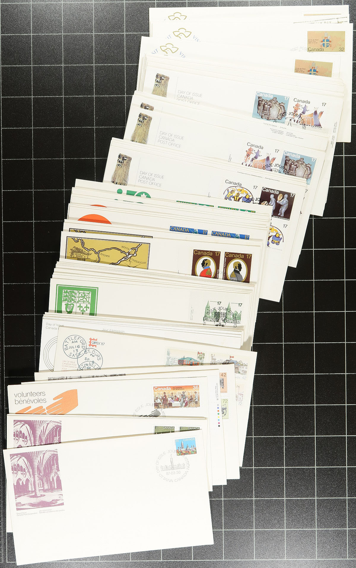 First Day Covers. Expensive First Day Cover Box #2: A large shoebox with a mix of mostly 1970's-1990's Canada Post Cacheted FDCs, with many plate blocks, including a number of matched sets, from a collector who didn’t shy away from the high cost (the $1, $2, $5 from the "Architecture" set are here in plate block matched sets, stamps face value $128.00), same for the "Mammals", and the list goes on. Includes some singles and pairs, and a small group of large "Canada Day" souvenir sheet FDCs. A quick browse indicates that the stamps’ face value is over $400.00. All unaddressed and look to be in good condition. Estimate =