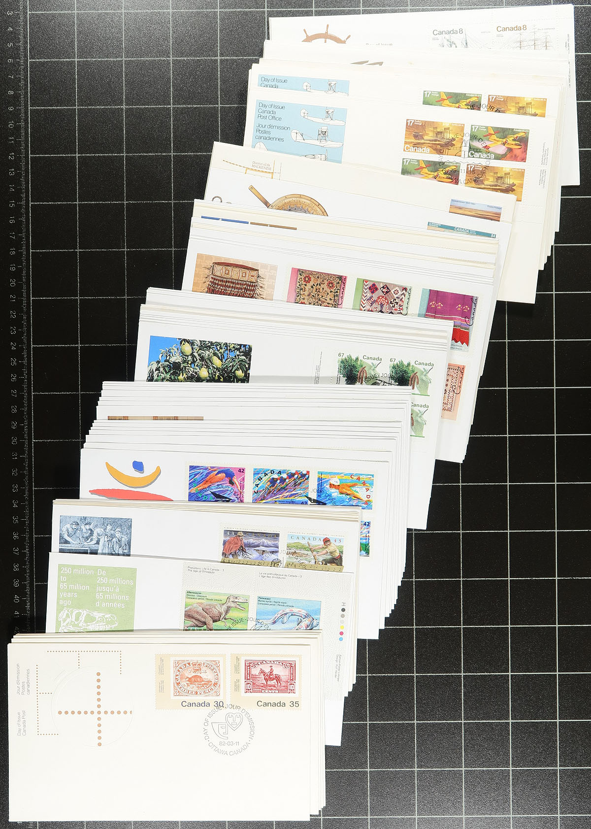 First Day Covers. Expensive First Day Cover Box #2: A large shoebox with a mix of mostly 1970's-1990's Canada Post Cacheted FDCs, with many plate blocks, including a number of matched sets, from a collector who didn’t shy away from the high cost (the $1, $2, $5 from the "Architecture" set are here in plate block matched sets, stamps face value $128.00), same for the "Mammals", and the list goes on. Includes some singles and pairs, and a small group of large "Canada Day" souvenir sheet FDCs. A quick browse indicates that the stamps’ face value is over $400.00. All unaddressed and look to be in good condition. Estimate =