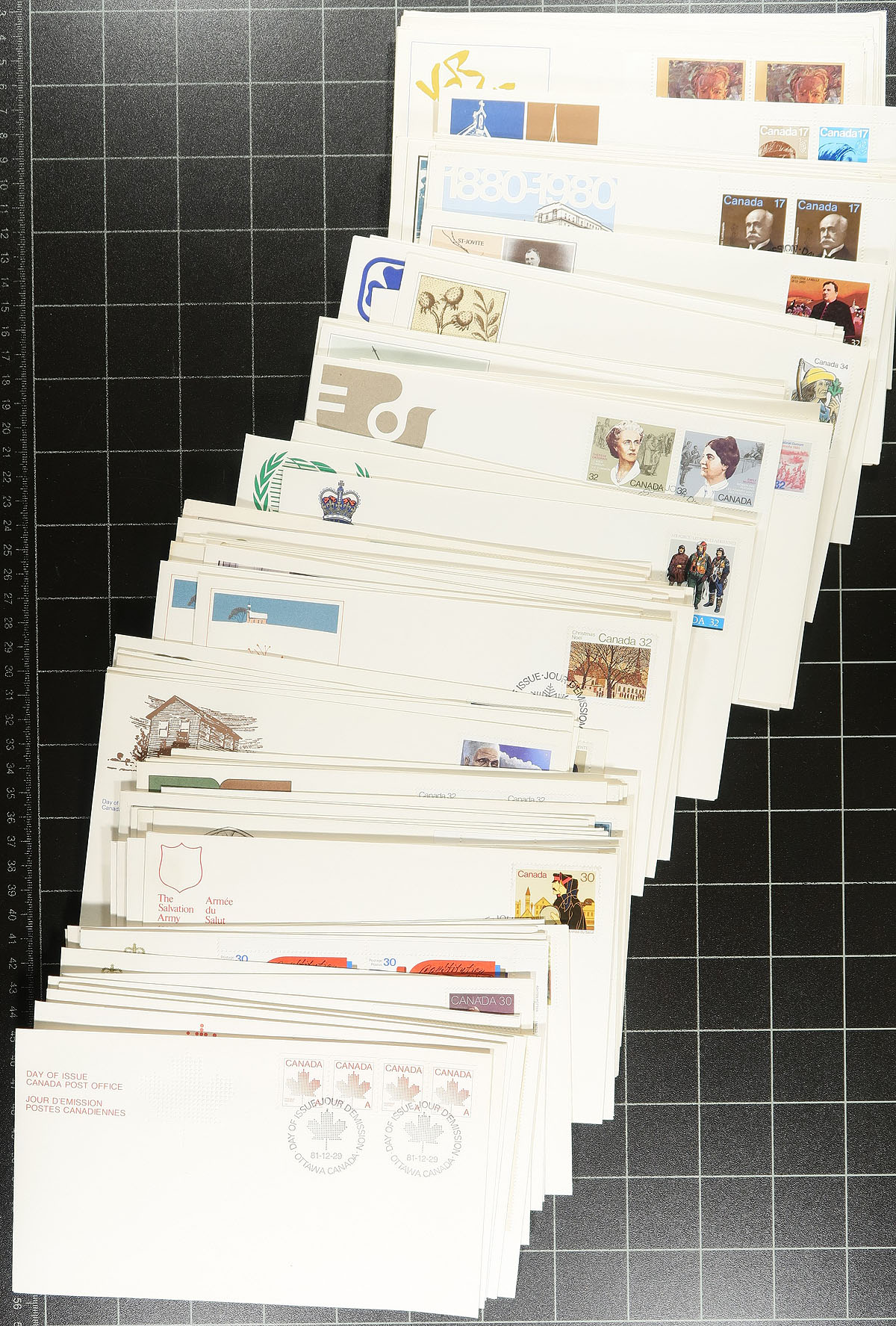 First Day Covers. Expensive First Day Cover Box #2: A large shoebox with a mix of mostly 1970's-1990's Canada Post Cacheted FDCs, with many plate blocks, including a number of matched sets, from a collector who didn’t shy away from the high cost (the $1, $2, $5 from the "Architecture" set are here in plate block matched sets, stamps face value $128.00), same for the "Mammals", and the list goes on. Includes some singles and pairs, and a small group of large "Canada Day" souvenir sheet FDCs. A quick browse indicates that the stamps’ face value is over $400.00. All unaddressed and look to be in good condition. Estimate =