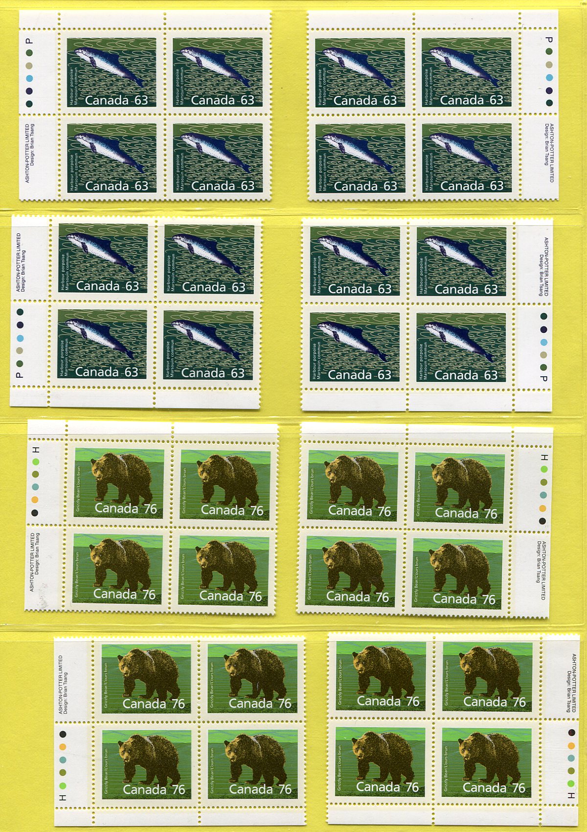 Mammal issue in mint never hinged plate blocks, including perforation and "Slater" paper variants. Six matched sets and a single and trio from two other issues. Best is the #1174a, #1176a and #1180c. One of Canada’s most popular modern issues. 2025-2026 Unitrade =