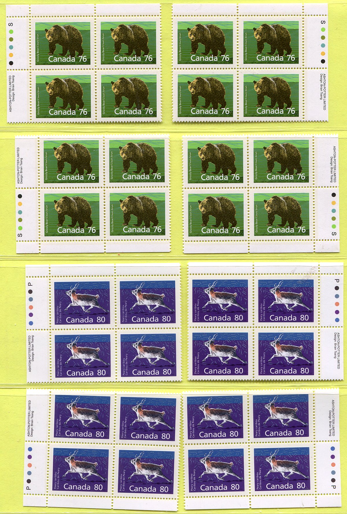 Mammal issue in mint never hinged plate blocks, including perforation and "Slater" paper variants. Six matched sets and a single and trio from two other issues. Best is the #1174a, #1176a and #1180c. One of Canada’s most popular modern issues. 2025-2026 Unitrade =