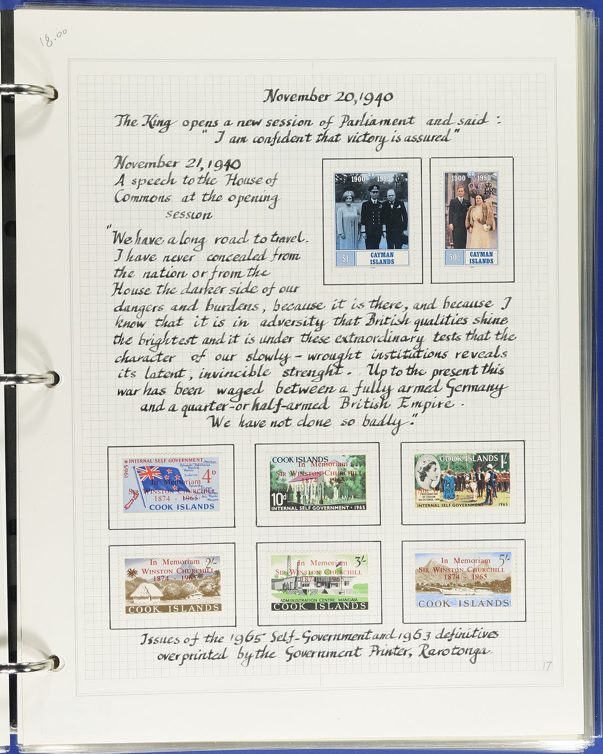 Topical assortment, with a nice collection of "Rowland Hill" anniversary topicals (lots of "Penny Black" and "stamp on stamp" action here). Winston Churchill (plus some WWII) mounted collection in a blue Lighthouse binder with matching slipcase. A small, mid-1970's exhibit of "Pirates"!!! Several pages of assorted "Costumes" (or "traditional clothing"), finishing with a smattering of Elvis and Marilyn. Estimate =