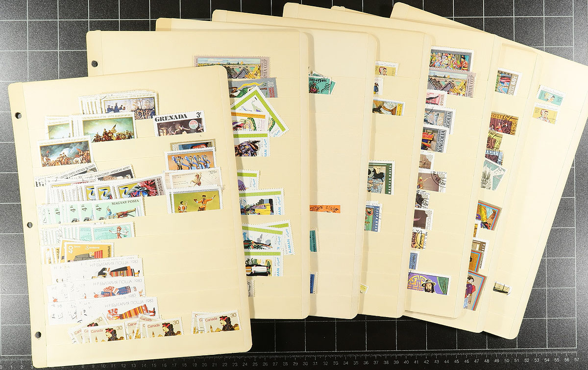 Topical assortment, with a nice collection of "Rowland Hill" anniversary topicals (lots of "Penny Black" and "stamp on stamp" action here). Winston Churchill (plus some WWII) mounted collection in a blue Lighthouse binder with matching slipcase. A small, mid-1970's exhibit of "Pirates"!!! Several pages of assorted "Costumes" (or "traditional clothing"), finishing with a smattering of Elvis and Marilyn. Estimate =