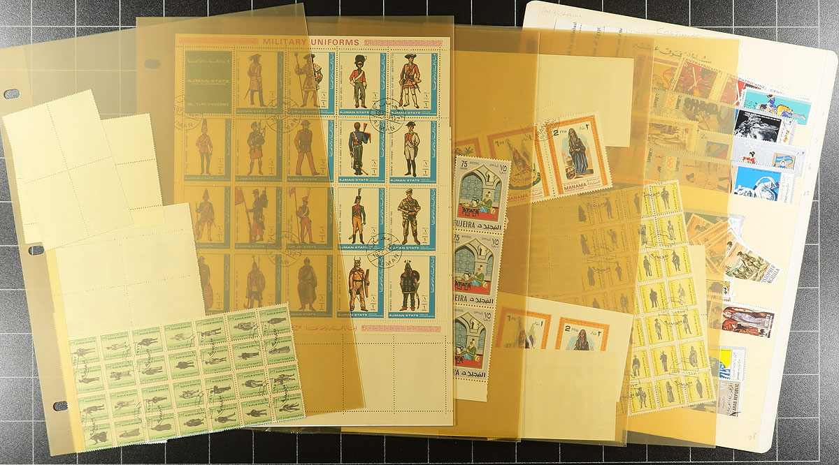 Topical assortment, with a nice collection of "Rowland Hill" anniversary topicals (lots of "Penny Black" and "stamp on stamp" action here). Winston Churchill (plus some WWII) mounted collection in a blue Lighthouse binder with matching slipcase. A small, mid-1970's exhibit of "Pirates"!!! Several pages of assorted "Costumes" (or "traditional clothing"), finishing with a smattering of Elvis and Marilyn. Estimate =