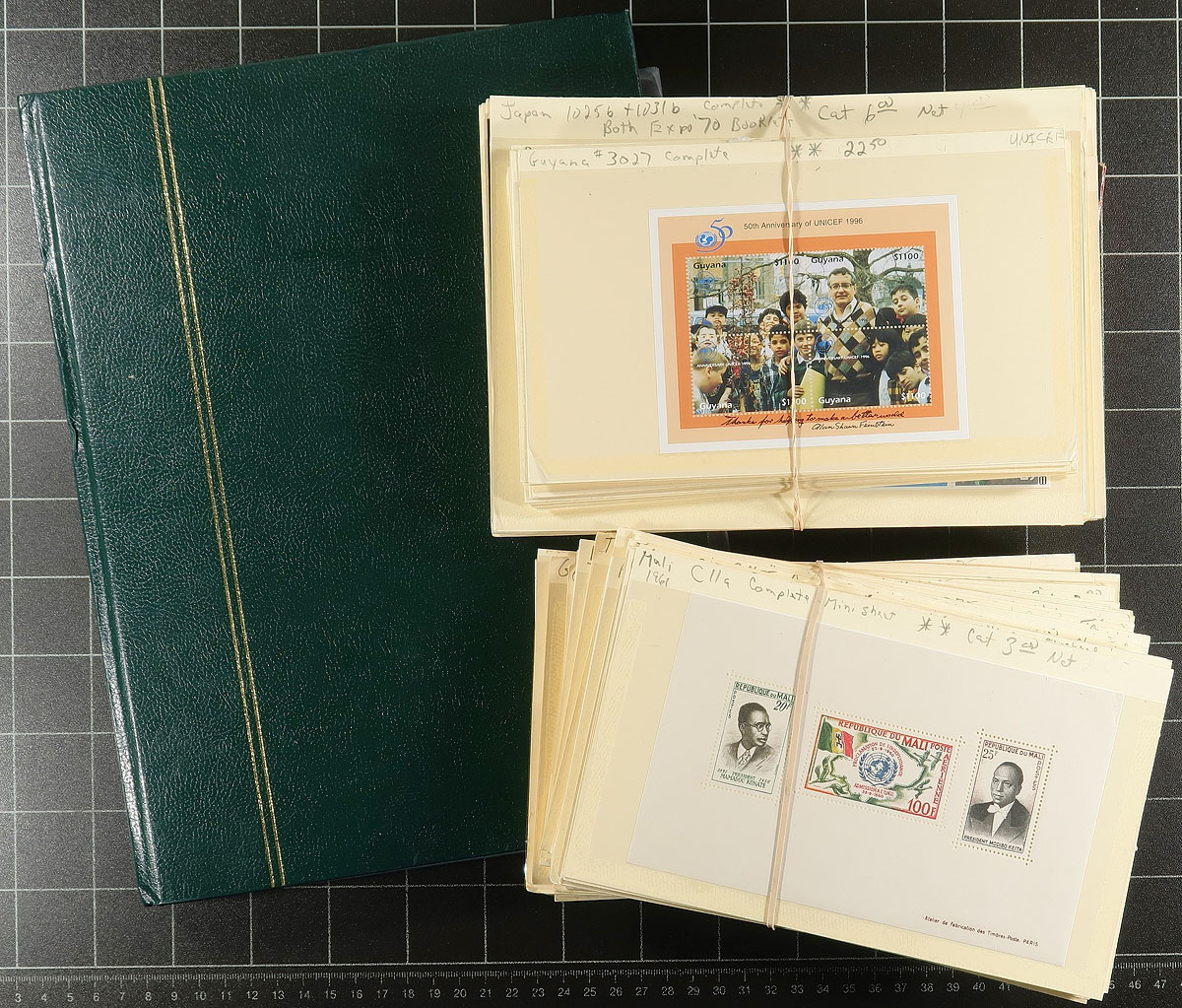 Souvenir Sheet a restrained hoard from a collector who never missed an opportunity to buy random assortments of mini panes, with lots of Europe, Africa, South America (almost everywhere but North America and Australasia). Lots of topical appeal with many identified and priced with individual catalogue values of $5-$20. A number of uncommon items. Almost all mint, never hinged. Several hundred dollars of catalogue value and comes with a near new 16-page stockbook. Estimate =