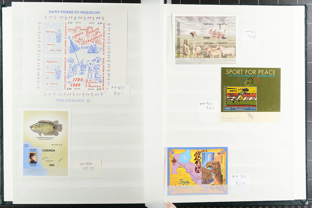 Souvenir Sheet a restrained hoard from a collector who never missed an opportunity to buy random assortments of mini panes, with lots of Europe, Africa, South America (almost everywhere but North America and Australasia). Lots of topical appeal with many identified and priced with individual catalogue values of $5-$20. A number of uncommon items. Almost all mint, never hinged. Several hundred dollars of catalogue value and comes with a near new 16-page stockbook. Estimate =