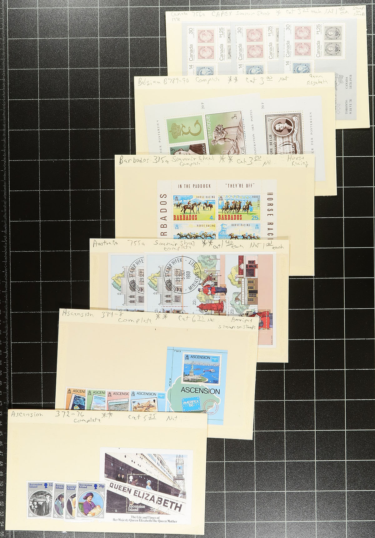 Souvenir Sheet a restrained hoard from a collector who never missed an opportunity to buy random assortments of mini panes, with lots of Europe, Africa, South America (almost everywhere but North America and Australasia). Lots of topical appeal with many identified and priced with individual catalogue values of $5-$20. A number of uncommon items. Almost all mint, never hinged. Several hundred dollars of catalogue value and comes with a near new 16-page stockbook. Estimate =