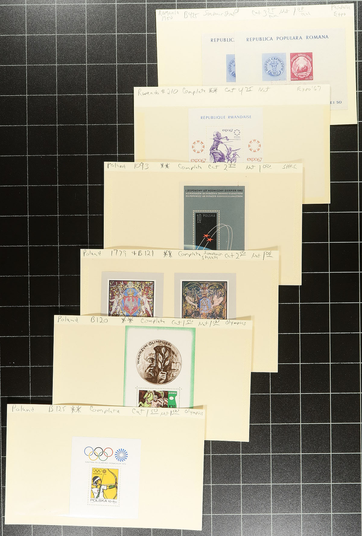 Souvenir Sheet a restrained hoard from a collector who never missed an opportunity to buy random assortments of mini panes, with lots of Europe, Africa, South America (almost everywhere but North America and Australasia). Lots of topical appeal with many identified and priced with individual catalogue values of $5-$20. A number of uncommon items. Almost all mint, never hinged. Several hundred dollars of catalogue value and comes with a near new 16-page stockbook. Estimate =