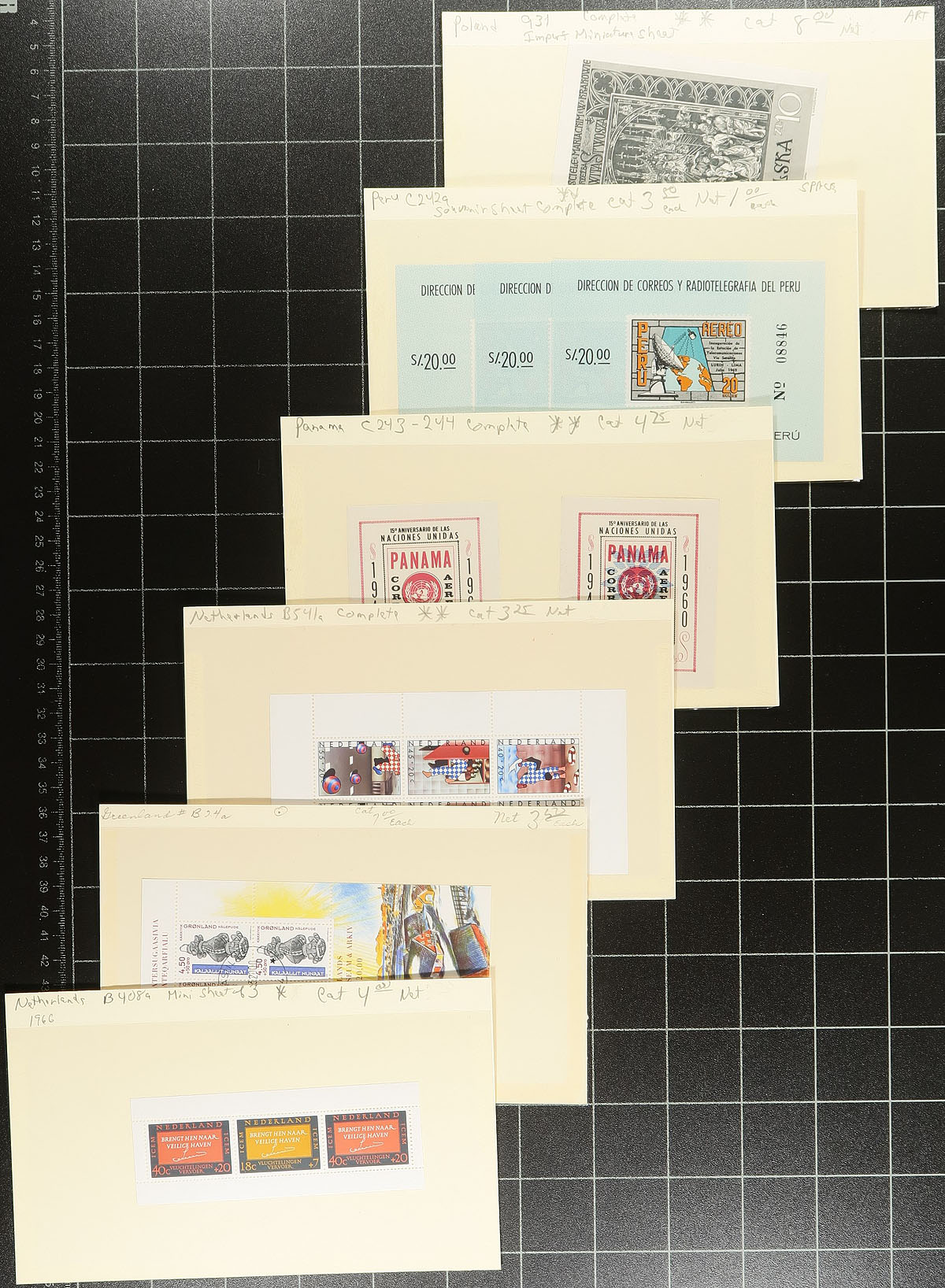 Souvenir Sheet a restrained hoard from a collector who never missed an opportunity to buy random assortments of mini panes, with lots of Europe, Africa, South America (almost everywhere but North America and Australasia). Lots of topical appeal with many identified and priced with individual catalogue values of $5-$20. A number of uncommon items. Almost all mint, never hinged. Several hundred dollars of catalogue value and comes with a near new 16-page stockbook. Estimate =