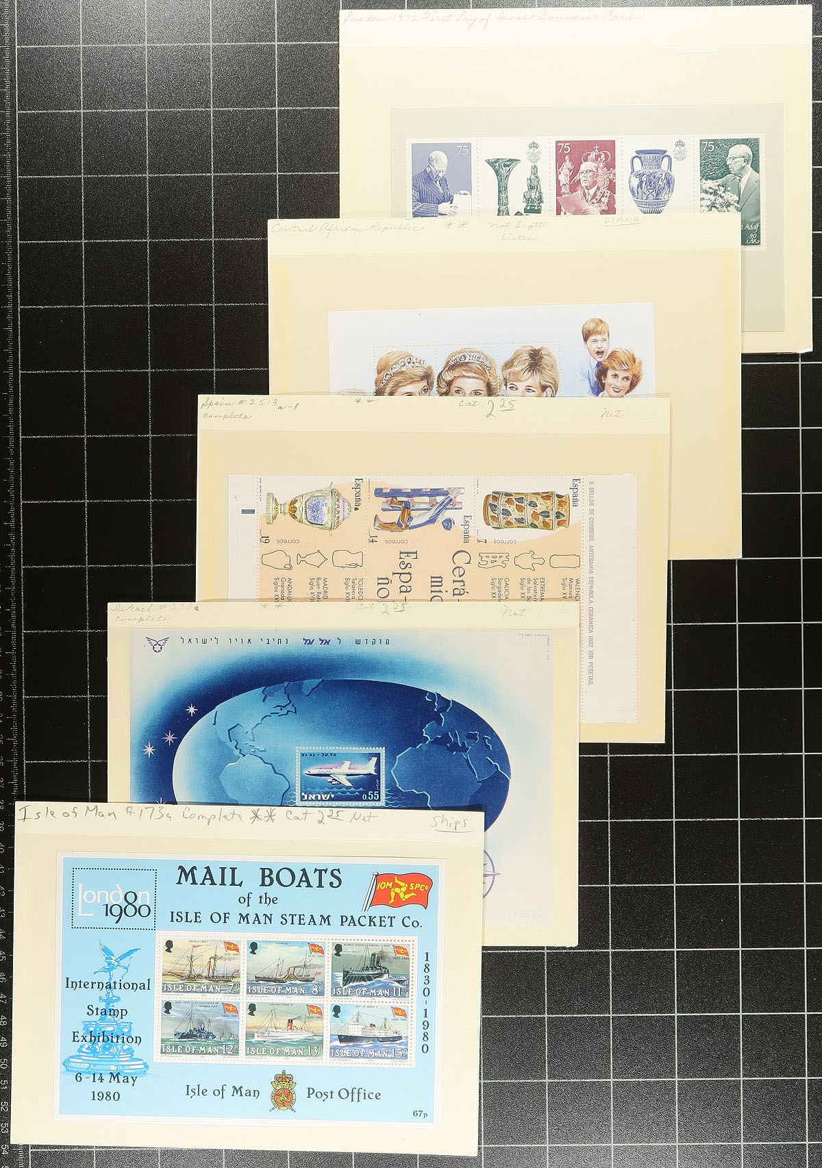 Souvenir Sheet a restrained hoard from a collector who never missed an opportunity to buy random assortments of mini panes, with lots of Europe, Africa, South America (almost everywhere but North America and Australasia). Lots of topical appeal with many identified and priced with individual catalogue values of $5-$20. A number of uncommon items. Almost all mint, never hinged. Several hundred dollars of catalogue value and comes with a near new 16-page stockbook. Estimate =