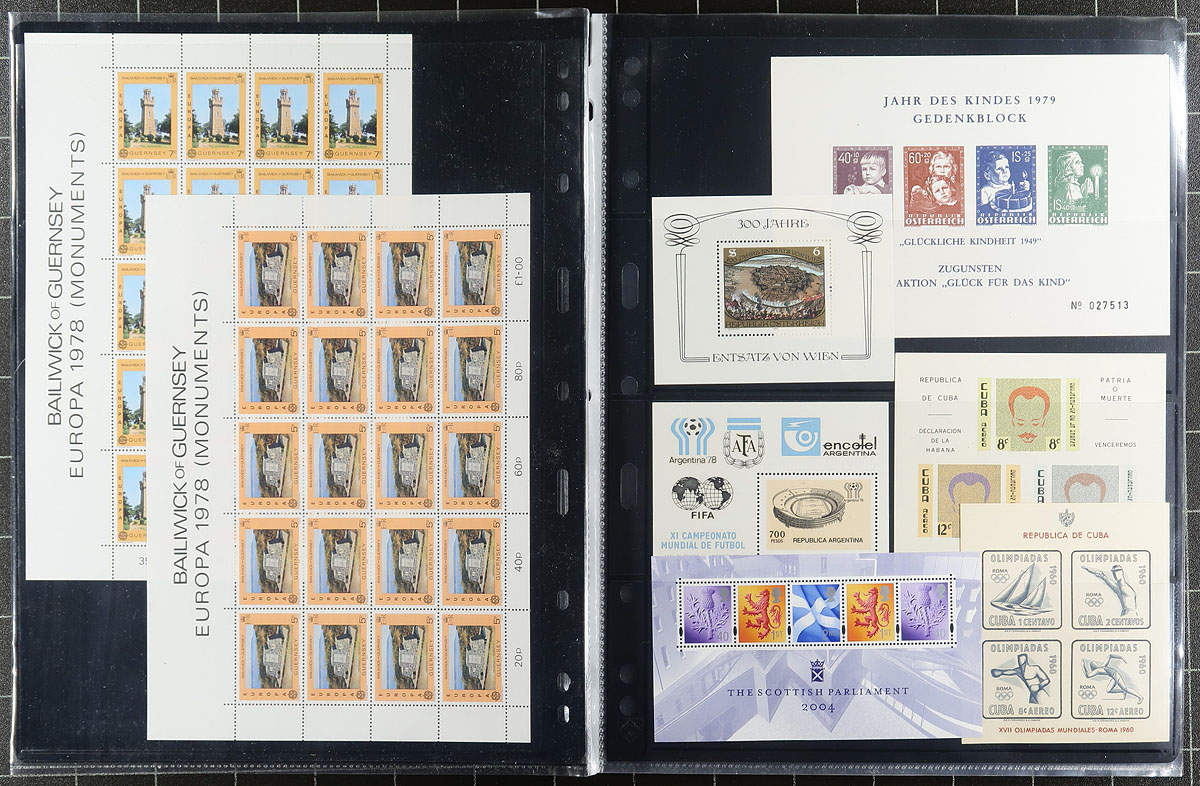 Souvenir Sheet a restrained hoard from a collector who never missed an opportunity to buy random assortments of mini panes, with lots of Europe, Africa, South America (almost everywhere but North America and Australasia). Lots of topical appeal with many identified and priced with individual catalogue values of $5-$20. A number of uncommon items. Almost all mint, never hinged. Several hundred dollars of catalogue value and comes with a near new 16-page stockbook. Estimate =