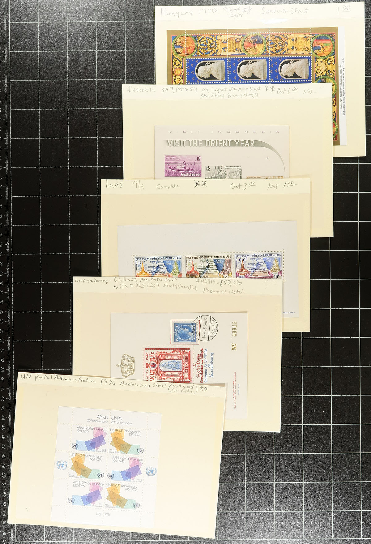 Souvenir Sheet a restrained hoard from a collector who never missed an opportunity to buy random assortments of mini panes, with lots of Europe, Africa, South America (almost everywhere but North America and Australasia). Lots of topical appeal with many identified and priced with individual catalogue values of $5-$20. A number of uncommon items. Almost all mint, never hinged. Several hundred dollars of catalogue value and comes with a near new 16-page stockbook. Estimate =